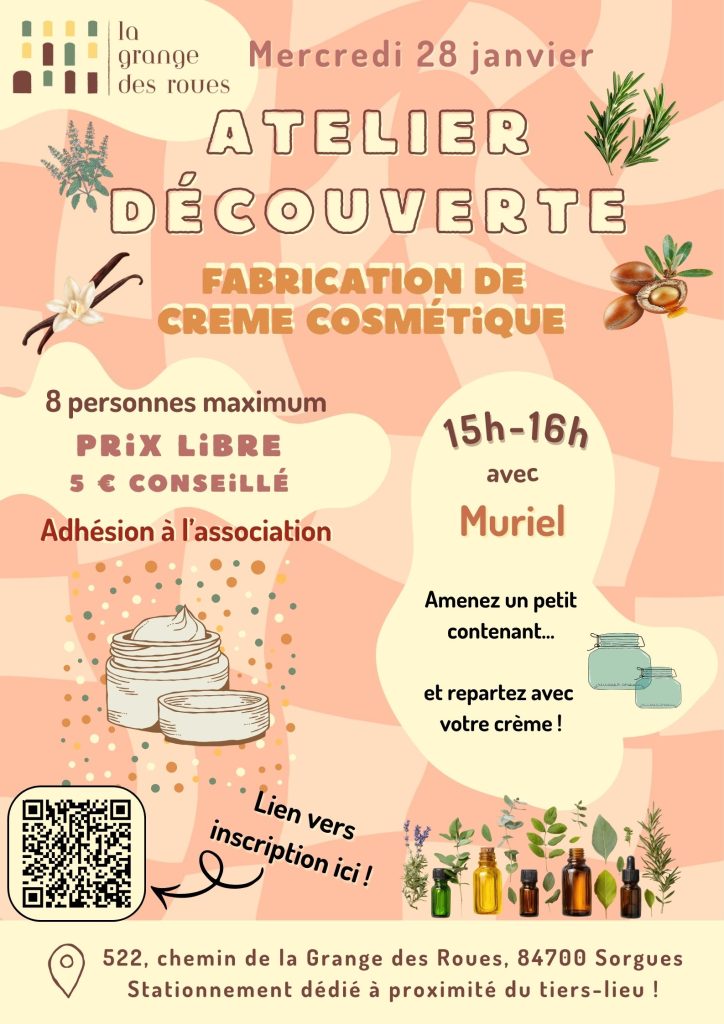 Accueillez la nouvelle année en préparant avec Muriel vos produits cosmétiques : apportez un petit contenant et repartez avec votre crème !